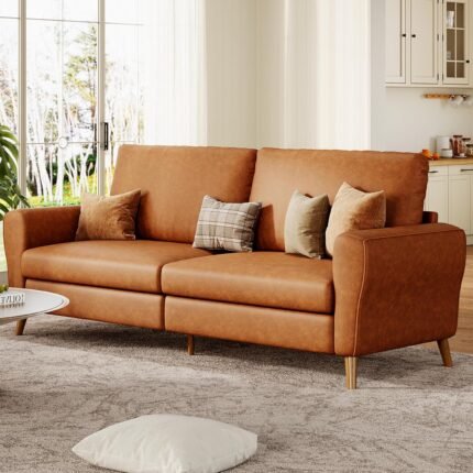 Kingfun Mid-Century Modern Couch, Faux Leather Sofa, 3 Seater Couch for Living Room with Rolled arms & Nailhead Trim, Dark