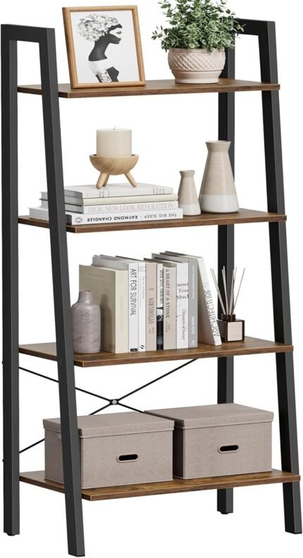VASAGLE Ladder Shelf, 4-Tier Bookshelf, Storage Rack, Bookcase with Steel Frame, for Living Room, Home Office, Kitchen, Bedroom, Industrial Style, Rustic Brown and Ink Black ULLS44X