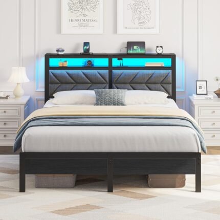 Seventable Bed Frame Full Size with Charging Station, LED Bed with Upholstered Storage Headboard, Metal Platform Bed with Under Bed Storage, No Box Spring Needed, Noise Free, Easy Assembly, Grey